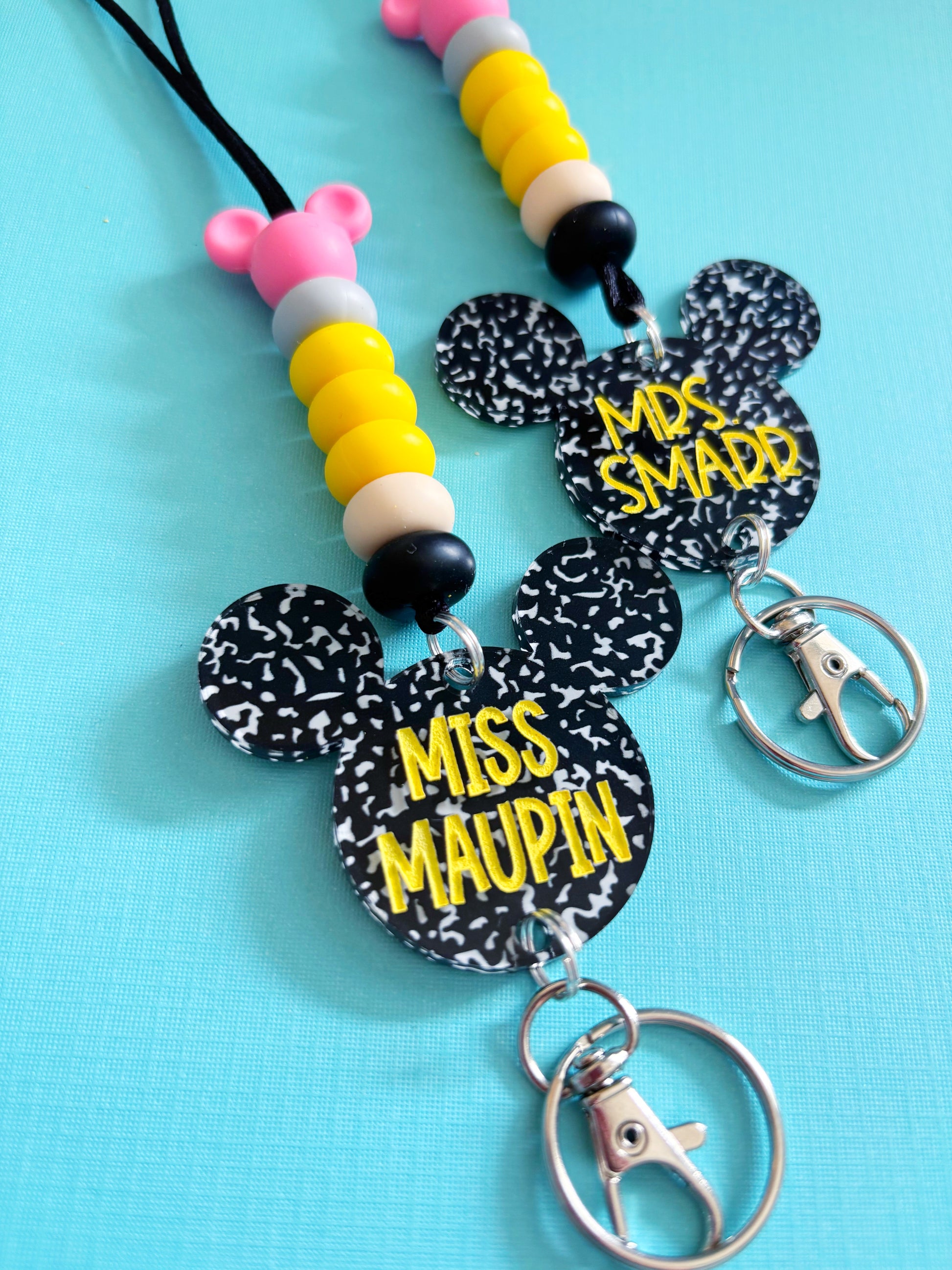 *A personalized lanyard is made of: a 2" engraved acrylic mouse name tag, silicone beads, and a breakaway safety snap clasp. Also comes with a 1.5" metal swivel lobster clasp and a split ring.